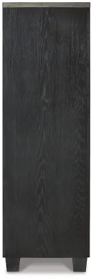 The Foyland door chest is casual contemporary style simply done right. Its two-tone color scheme features a rich brushed black main color accented with a beautiful dusty grayish brown wood tone. And there's plenty of storage to accommodate your wardrobe needs with ease. The dresser has 5 soft-close drawers, and behind the door you'll find pull-out trays for shoes or other accessories, along with shelving for bulky items.