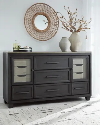 The Foyland dresser is casual contemporary style simply done right. Its two-tone color scheme features a rich brushed black main color accented with a beautiful dusty grayish brown wood tone. With 11 soft-close drawers (three located neatly behind each door) this dresser offers plenty of storage to accommodate your wardrobe needs with ease.