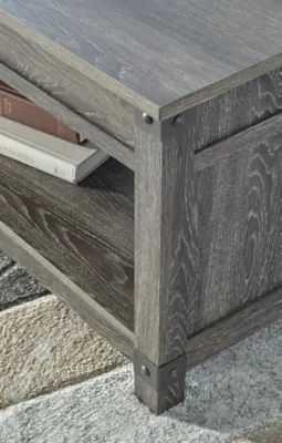 Open the door to modern farmhouse style with the Freedan lift-top coffee table. The beautiful woodgrain look and classic crossbuck metal accents are a cool touch, while the lower shelf provides surface space for fashionable home accessories. Sporting a gray replicated wood grain effect, its handy spring-loaded mechanism brings the tabletop closer to you. This versatile table makes it easier than ever to eat, work or play from the comfort of your sofa.