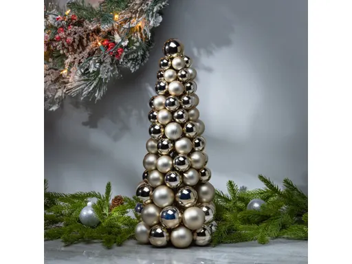 The perfect addition to your chic and elegant holiday decor. This Christmas tree is composed of non-crushable ornaments, creating a beautiful and unique focal point this holiday season. The matte and reflective finishes of the ornaments add depth and texture to the cone, creating a stunning visual display. The non-crushable ornaments ensure that your ornament cone will look beautiful for years to come. Perfect for use as a standalone decoration or as part of a larger Christmas display, its chic and elegant design makes it a great choice for modern or traditional decor styles.