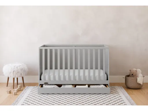 Create your dream nursery with the Graco Theo 3-in-1 Convertible Crib with Drawer. Featuring a timeless design with a solid-panel headboard and sides, the Theo complements any nursery style. An under-crib drawer offers convenient storage for nursery essentials. Crafted from pine wood, engineered wood, and wood composites, its durable finish is tested to meet or exceed ASTM and CPSIA safety standards. JPMA Certified, the Theo has been rigorously tested to meet all voluntary and mandatory safety standards. Designed to grow with your child, the crib includes an adjustable mattress support base with four height settings, so you can lower the mattress as your child grows (suitable until they can climb out or reach 35 inches/89 cm). It converts from a crib to a toddler bed (toddler guardrails sold separately) and daybed, accommodating any standard full-size crib and toddler mattress (mattress sold separately; we recommend Graco crib mattresses). Graco proudly holds the Parent Tested Parent Approved (PTPA) Seal of Approval for nursery furniture. Backed by a 1-year limited warranty, the Theo requires assembly. Please note, this model does not convert to a full-size bed.