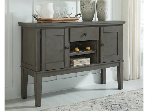 Cool and on-trend. The Hallanden server sports an antiqued gray color for a contemporary-yet-casual feel. The server features two cabinets, a smooth-gliding drawer and an open cubby with a wine rack, making it a breeze to clear away clutter and expand your serving space. Dining with friends and family has never been so stylish.