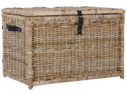 The chestnut brown wicker weave and leather strap accent on this lidded trunk make it a beautiful addition to any space. In addition to enhancing style in a room, its functional lid and large capacity make it a valuable tool for hiding unwanted clutter from holiday decorations to laundry. Best of all, this versatile trunk folds flat for storage and is easy to assemble, so it can be tucked under a bed when not in use.