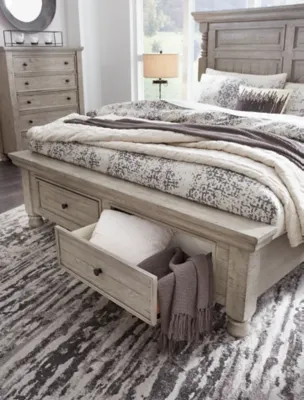 Embrace the feel of a mansion in the countryside when you revel in the romance of the Harrastone queen panel bed. With its weathered light gray finish, substantial presence and thick mouldings, this piece has a sense of timeless beauty. Instantly the highlight of your home, the picturesque bed features turned posts that seamlessly connect to the main panels. The footboard’s two smooth-gliding storage drawers with aged iron-tone knobs are a stately finishing touch.
