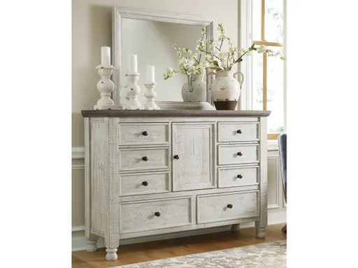 What a fresh interpretation of country classic style. Inspired by American farmhouse craftsmanship, but with an elevated sensibility, the Havalance dresser and mirror set blends distinctive details such as turned post accents and raised drawer fronts for a substantial look that feels right at home. Those who appreciate rustic character should take note of this dresser’s thick profile crown mouldings, beautified with a vintage two-tone finish.