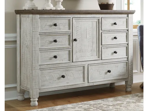 What a fresh interpretation of country classic style. Inspired by American farmhouse craftsmanship, but with an elevated sensibility, the Havalance dresser blends distinctive details such as turned post accents and raised drawer fronts for a substantial look that feels right at home. Those who appreciate rustic character should take note of this dresser’s thick profile crown moulding and stylish center cabinet, beautified with a vintage two-tone finish.