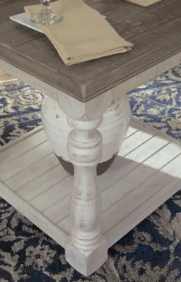 With its richly rustic finish and textural mix, the Havalance end table goes to town on bygone beauty. Its distressed two-tone treatment blends a weathered gray with vintage white for an utterly charming effect. Robust legs lend a hearty, substantial look that feels right at home.