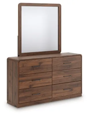 Grace your restful retreat with an added dose of refinement. The Hollinaze dresser with mirror showcases a stunning rich brown wood tone, with sleek drawer pulls for an added layer of luxury. A rounded top and mirror frame soften the silhouette, elevating the look. It’s curated, contemporary and utterly chic.
