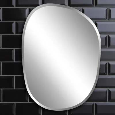 This piece is all mirror. No frame, no decoration, no finishes. Just its simple, beautiful self. It is an oblong, asymmetrical rectangle. Alone or in multiples, the Frameless Arched Mirror is a perfect accent piece for an entryway, bathroom, bedroom or any room in your home. D-rings are affixed to the back of the mirror so it is ready to hang right out of the box! Other frameless sizes and shapes are available.