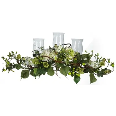 Three times the beauty, three times the pleasure! This stunning piece consists of three separate candle holders, surrounded by a lush bed of hydrangeas. The hydrangeas represented are in different stages of bloom, so you get the entire spectrum of texture and color. This beautiful centerpiece will bring years of joy to those who sit at your table.