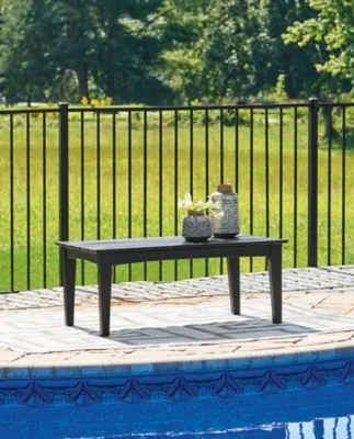 Drift into outdoor entertainment bliss with the Hyland Wave coffee table. Dressed in a smart black for a sophisticated feel, it weathers sunny summer days and cozy winter nights with durable MEGA-TUFF® HDPE material. When it comes to form and function, the table's rain-shedding slatted design simply goes with the flow. Use it to hold outdoor decor, drinks or snacks.