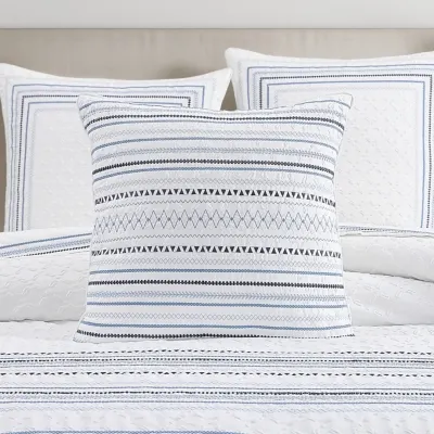 The Bayside 20 Inch Decorative Throw Pillow is embroidered with a nautical stripe design on an embossed white base fabric. Finished with a self-fabric cord and a textured white fabric on the reverse. Pair this accent pillow with the Bayside bedding set by J. Queen New York for a complete look.