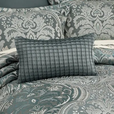 The uniquely crafted Renata Boudoir Pillow adds dimension to the ensemble with an ornate pleating technique cut from a woven teal satin fabric. The accent pillow reverses to solid teal and is specially made to coordinate with the Renata bed set. 12" x 20".
