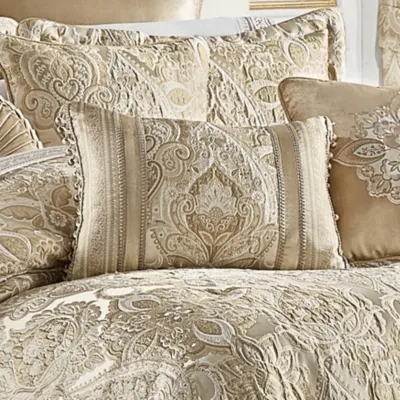 The Sandstone Boudoir Throw Pillow is beautifully constructed with a traditional woven damask pattern centered, complemented by a bordering beige velvet and lovely jacquard stripe. The pillow is finished with a coordinating gimp and multi-colored tassel ball fringe. Pair this 13x21 inch pillow with the Sandstone bedding set by J. Queen New York for a complete traditional luxury look.
