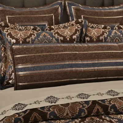 The Sofia Bolster Throw Pillow features a woven chenille stripe in striking shades of blue, chocolate and golden hues. This beautiful full-length gusseted bolster pillow is generously filled for durable long-lasting support, reverses to a solid chocolate chenille fabric, and it is finished with a self-fabric cord for a polished trim. Pair this luxe accent pillow with the Sofia bedding set by J. Queen New York for a complete look.