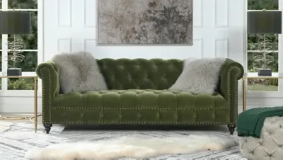 Look no further than the classically bold style of the Alto Chesterfield Sofa by Jennifer Taylor Home for your seating needs. The all over button-tufting is created with hand-covered buttons in matching upholstery and pulled deep for a truly heirloom look. The bronze-tone nailhead accents are individually set by master craftsmen and lend a subtly glamorous accent to the stately silhouette. This three-seater couch is perfectly sized for entertaining and lounging, with generous rolled shelter arms and medium deep tufted seats that make comfort second nature. Its timeless look can anchor any look in your home from transitional to modern glam.