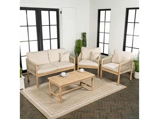 An inspired mix of rustic and modern styles, our patio conversation set features two tub-shaped chairs, matching settee and a cocktail table. The unique design combines the textures of rope webbing and natural wood grain on a sturdy wood frame. The contemporary silhouette features comfortable back and seat cushions covered in outdoor fabric.
