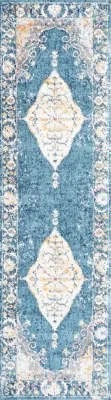 An ornate border and medallion design give this rug a French Country cottage look; but the modern teal color palette has an art deco, bohemian vibe. The accents in a mingled weave create a vintage, distressed look. Use this romantic rug in a family room, bedroom, living room, dining room or entry; the busy pattern is kid and pet friendly.