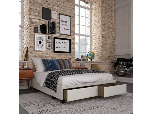 Sleek and modern, this upholstered storage bed base provides 2 large storage drawers to help keep your space organized. Euro side glides on the drawers ensure smooth opens every time. There is no headboard on this bed base, which opens up options for a minimalist appearance, while maintaining support and storage function. All sides are upholstered and slightly padded for a premium look and feel. The storage drawer deck comes pre-assembled and provides solid support at the foot of the bed. That plus the 8 cross slats provide a durable support system that easily supports up to 700 lbs. No box spring required! The top of the bed base is just over 11' high. Entire bed ships in 1 box for easy transport. Bed assembles in under 15 minutes and all hardware is included. Limited 1 Year Warranty.
