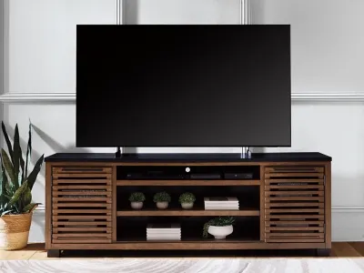 Double down on casual chic with the two-tone look of the Kallari TV stand. Its warm brown and matte black finishes reflect your eye for modern design. The trend-right slatted styling brings added charm. And with handy cabinets, shelving and cord management holes, keeping entertainment consoles and accessories organized is a breeze.