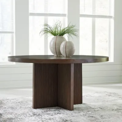 The Korestone dining table exemplifies casual contemporary design with an urban vibe. Warm and inviting with a rich brown finish, it makes meals around the table that much sleeker thanks to its ultra-modern silhouette. A trend-right reeded base subtly nods to mid-century modern design. What a stunning reflection of your simple-meets-elegant sensibility.
