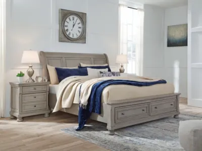 Satisfying your taste for tradition, the Lettner king sleigh bed with storage sports serene sophistication. Forever classic design details—inlaid panels, silvertone patina hardware and bun feet—are so easy to love. Burnished light gray finish elevates the look with modern sensibility. Two roomy drawers keep your essentials organized in style. Mattress available, sold separately.