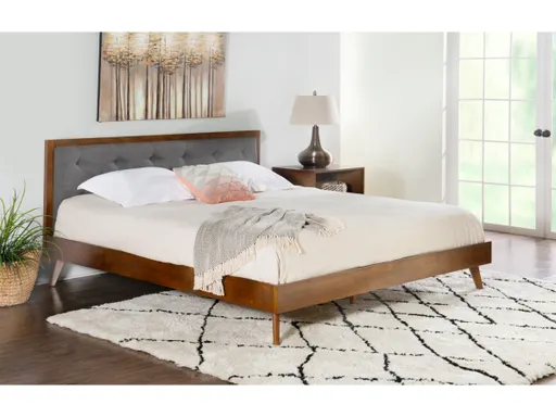 This wood and upholstered King sized bed in a mid century modern design will elevate the master bedroom in style and elegance. Button tufted headboard in a medium gray fabric. Includes the headboard, footboard, side rails and slats. Perfect for either memory foam or spring mattress.