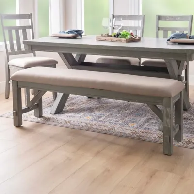 Outfit any room with this perfect bench. It features traditional straight lines and a simplistic style. A solid tan fabric in a basketweave construction covers a plush, comfortable seat. It has a durable rubberwood, MDF and Ash veneer construction in a weathered gray finish, which delivers an updated farmhouse vibe. Some assembly required.