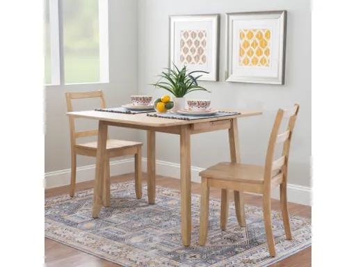 This classically styled table and chair set creates extra seating anywhere in your home. It includes 2 chairs and a rectangular table. The table top opens easily, doubling in size, and folds flat to save space when not being used. Perfect for creating extra seating for surprise dinner guests, during the holidays, or as a kitchen table in a cozy studio apartment. Also, a hidden storage area under the tabletop is perfect for placemats, napkins, and cutlery. Finished in natural with rustic wire brushed texture, this set will effortlessly blend in with your existing decor.