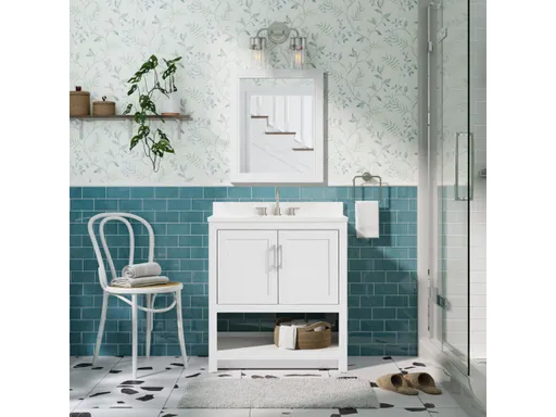 Elevate your bathroom with this versatile 31" transitional vanity set, complete with a vanity, countertop, and mirror all in one convenient package. Designed for both style and function, the vanity showcases a striking white ash finish that complements a range of modern and classic interiors. The soft-close doors reveal a removable interior shelf with a pre-cut opening for seamless plumbing access, ensuring a clutter-free storage solution. Adjustable floor levelers ensure a steady, wobble-free installation that will keep your bathroom looking great for years to come. For enhanced design flexibility, this vanity includes two sets of pre-installed hardware brushed nickel for a sleek look and matte black for a bold, contemporary touch. Topped with a white composite surface, the countertop comes pre-drilled for 8" widespread faucets (sold separately), making installation a breeze. The spacious open lower shelf is perfect for showcasing neatly folded towels, decorative baskets, or essential bathroom accessories. Looking to expand your storage? Pair this vanity with the optional floor tower (sold separately), which conveniently attaches to the side for a cohesive, space-saving solution. Complete the look with the matching 3-in-1 cabinet (sold separately), offering adaptable storage configurations as an over-the-toilet unit, a dual wall and floor cabinet, or a freestanding storage tower with shelves.
