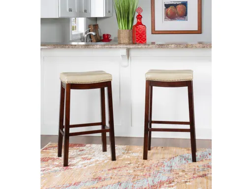 Chic and dressed in understated flourishes, this pair of bar stools are the perfect addition to a boho kitchen or home bar. The solid wood frames are finished in a warm brown stain and reinforced by footrails for added balance and support. Mottled beige faux leather upholstery covers cushioned seats with double needle stitching and antique brass nailhead trim that attracts the eye. With a seat height of 32.25 inches, these stools are perfect for tavern tables, bars or kitchen islands 40 inches to 43 inches high.