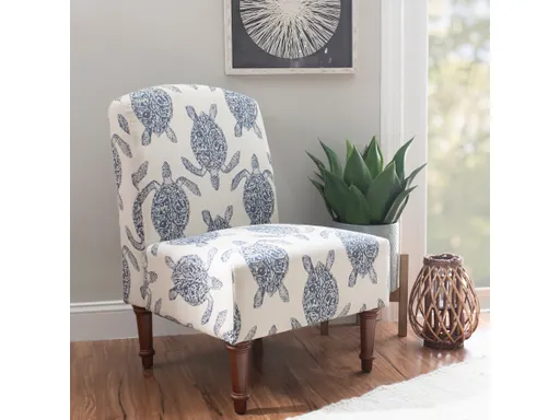 Elevate your reading nook or living space with this charming accent chair, designed to complement a modern coastal aesthetic. Showcasing a whimsical turtle print in rich indigo and soft cream tones, the upholstery a durable polyester and cotton blend adds a playful yet sophisticated touch. Plush cushioning ensures a cozy seating experience, while the sturdy wooden frame provides lasting durability. The elegantly turned wood legs, finished in a stylish gray wash stain, infuse a subtle vintage charm. With its armless silhouette, this chair seamlessly fits into compact spaces, making it a versatile and inviting addition to any room.