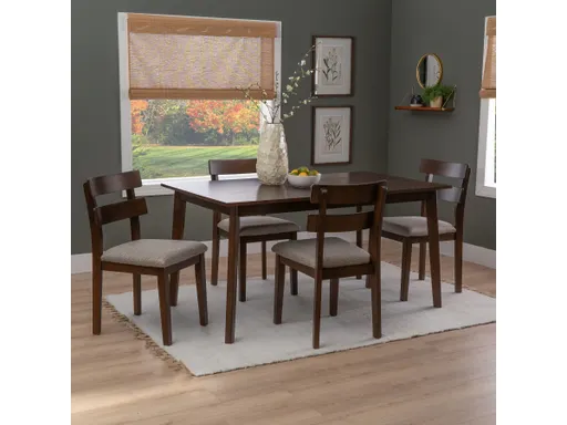 Experience the perfect blend of modern farmhouse charm and mid-century minimalism with our delightful 5-piece set. Rich brown wood surfaces showcase knots and grain patterns, creating a cozy, worn in look. The four upholstered chairs boast a chic grey fabric with a crosshatched construction, offering a stylish heathered effect. This performance grade fabric ensures resilience against stains and moisture. Enjoy a spacious 60"L x 36"W tabletop for delightful dining, comfortably seating four. Elevate your space with warmth, style, and the promise of enduring quality.