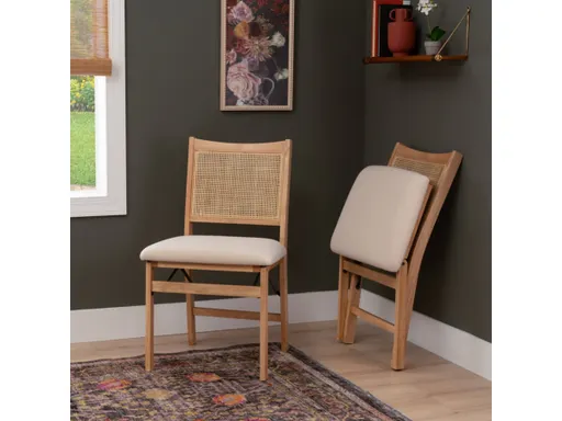 Extra seating has never looked so good. Featuring a lightweight foldable design, this cane back folding chair is as functional as it is tasteful and timeless. The backrest's woven cane detail lends to an open and organic feel, while the cushioned seat, upholstered in a beige linen-look polyester fabric, offers long-term comfort and easy maintenance. The solid wood frame is finished in a glossy natural stain that highlights knots and patterns in the woodgrain, while the metal folding mechanism allows for easy storage when the party's over. Perfect for formal get-togethers, casual soirees, and beyond.