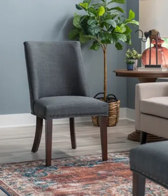 Add elegance to your meals with this sophisticated dining chair. Upholstered in dark gray linen-like polyester, it features lovely, antiqued bronze-tone nailhead trim. The padded seat offers perfect comfort while being easy to clean. An arc shaped backrest adds to the comfort and pleasing design with solid wood legs, finished in dark espresso, that provide stability for hours on end. For a flawless finishing touch, you