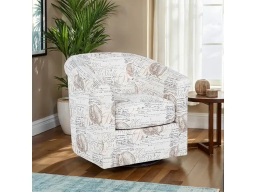 Add a touch of seaside charm to your space with this fully assembled swivel accent chair. Wrapped in a soft, woven 100% polyester fabric featuring a mix of coastal seashells, scrolls, and swirl patterns, this chair brings both personality and comfort to your home. The sturdy plywood frame rests atop a smooth 360-degree swivel base made from powder-coated black metal—offering durable function with a sleek finish. Whether it's placed in a reading nook or a sunlit corner, this chair delivers style, comfort, and easy relaxation.
