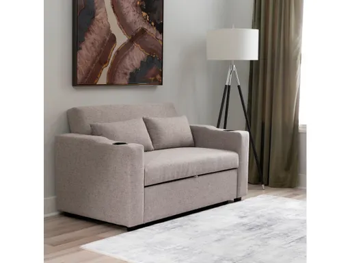 Elevate your hosting space with this stylish and versatile Sofa Bed. Featuring a sleek black stain, lacquer finish, and 100% woven polyester fabric in grey, this sofa bed seamlessly blends modern aesthetics with functionality. Enjoy the convenience of built in cupholders for your favorite beverages, making relaxation even more enjoyable. Effortless mobility is at your fingertips with the sleek casters, allowing you to easily adapt to any space. With a bed width slightly larger than a twin, this piece is perfect for small living rooms, dorms, apartments, studios, and offices. This sofa bed is your ideal choice for both comfortable seating and a cozy sleeper option.