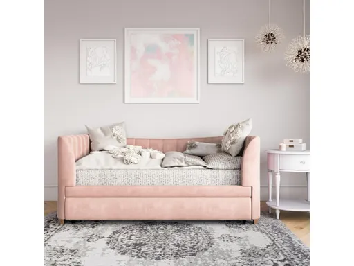 Remember when you were a kid and instead of a "real" bed like all your friends seemed to have at slumber parties, you had an unfashionable daybed instead? Well, now that you’re all grown up and designing your own kid’s room decor, let Little Seeds present to you a much more stylish kids’ daybed than the one you grew up with: the Valentina pink upholstered daybed with trundle. Beautifully upholstered in pink faux velvet with vertically stitched tufting, your little one will be thrilled to call this elegant daybed their own. Not only will you and your child both love the look of this chic daybed, the simple, pull-out trundle will make sleepovers easy and fun. The Little Seeds Valentina pink upholstered daybed with trundle fits two standard twin-size mattresses, no additional box spring or foundation required.