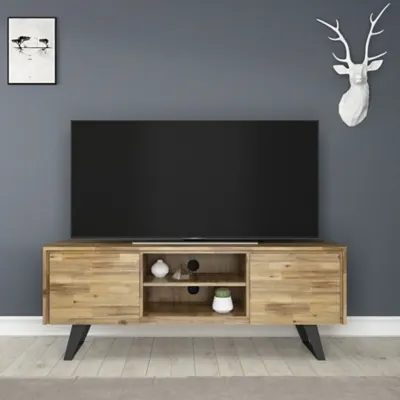 Handcrafted with a perfect combination of metal and solid wood, this TV media stand adds an urban industrial accent to any home. The design evokes an era long past with its industrial style roots and retro design elements, including sleek, angled metal legs, a handsome wood top with storage compartments, concealed metal hinges, magnetic door catches and discreet hand pulls on the doors. This TV stand perfectly accommodates TVs up to 70 inches, with plenty of storage space for all your media and gaming devices.