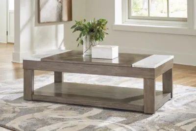Welcome casual, contemporary style and functionality to your home. The Loyaska lift-top coffee table is equipped with a convenient lift-top surface for working or dining from your sofa, as well as a spacious lower shelf to display treasured items. Natural white marble accents deliver a mixed-material vibe, while the grayish brown finish lends a laid-back look that’s so welcome at the end of a long day. Casters allow you to move the table whenever and wherever it’s needed.