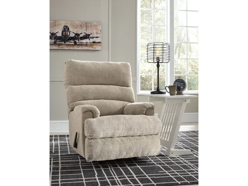 Roll out a cool look for your man cave or femme den with the Man Fort recliner. Waterfall cushioning on the high back is paired with a double-roll footrest for a high-style aesthetic that cradles you in comfort from head to toe. Tweed-weave neutral upholstery is decadently soft and loaded with texture.