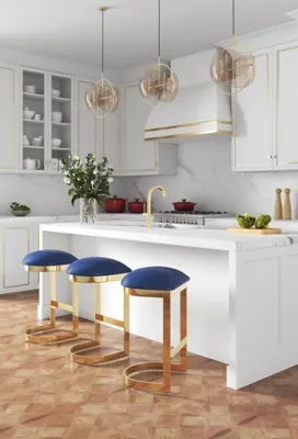 A study in balance. This bar stool is all understated luxury. Featuring a floating frame design with a curved base, its unique modern style creates an undeniable sense of lightness. Smooth faux leather upholstery is tailored into a sleek cushioned seat that rests easily on a polished metal base, enhancing its effortless feel. Its chic polished brass finish lends a subtly sumptuous touch that will elevate the atmosphere in any dining space. To complete the look, coordinate with the Aura Dining Chair.