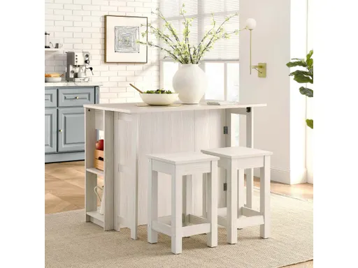 Discover the charm and functionality of the Meadowbrook 3-Piece Small Kitchen Island Set. This island table is crafted from durable particleboard, MDF, and paper laminate. This free-standing kitchen island cart features two cutlery drawers and open shelving, perfect for storing kitchen essentials and displaying decor. The innovative drop leaf design of this freestanding kitchen island not only increases your prep area but also converts it into a dining space. It comes with two matching stools, featuring square seats and footrests, which turn the island into a bar stool table for enjoying drinks post-meal. Complete with non-marking pads to protect your floors, this 3-piece island set is ideal for meal prep and casual dining, making it a stylish addition to any kitchen. Assembly required. Set includes: 1 kitchen island, 2 stools. Island weight capacity: 205 lbs.; stool weight capacity: 500 lbs.