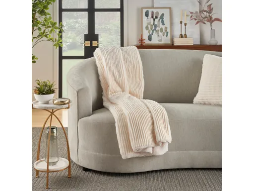 In a seamless blend of form and function, this ivory faux fur Mina Victory throw blanket brings comfort with a touch of chic style to your living room or bedroom. The rippled vertical stripe pattern has an amazingly soft texture that adds subtle dimension. A solid faux fleece inner lining invites tons of warmth as you cuddle up with a cup of tea or hot cocoa on cooler nights. Throw blanket measures 50” x 60”.