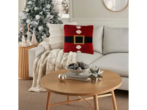 Invite an instant dose of holiday cheer to your seasonal decor with this Christmas throw pillow from Mina Victory Home Accents. The front cover features a whimsical close-up of Santa's belt and buttons in a chunky French knot construction that feels amazingly soft to the touch. Complete with a plump polyester insert and zipper closure for easy spot cleaning. This 20" square pillow is made from a blend of polyester and cotton with a subtle, eye-catching sheen.