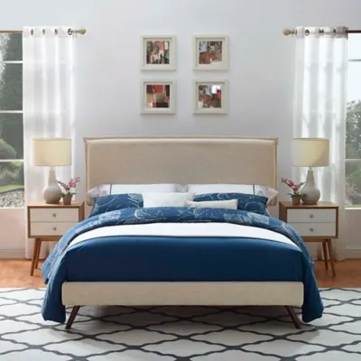Accelerate your bedroom decor with the Amaris Platform Bed. Made with a solid wood frame upholstered in polyester fabric, Amaris features tapered wood legs, plastic foot glides, stylish headboard, and ten sturdy wood slats with a centered supporting bar and two support legs for enhanced stability. Due to the wooden slat support system, the use of a box spring is unnecessary. Amaris supports memory foam mattresses such as our Aveline series. Perfect for mid-century modern, minimalist and contemporary bedrooms. Mattress not included. Assembly required.
