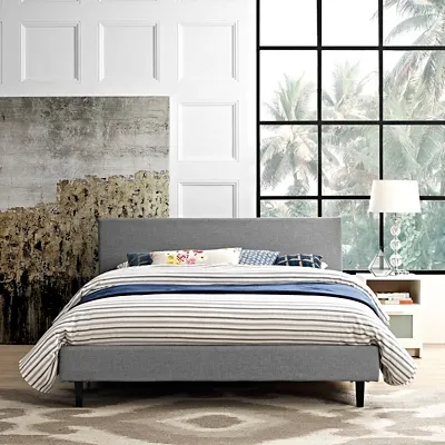 Restyle your bedroom decor with the Anya Platform Bed. Designed with a chic avant-garde look, Anya comes with an upholstered polyester fabric base and headboard, solid wood legs, and a slatted wood support system that eliminates the need for a box spring. Complete with a reinforced center beam with supporting legs for maximum stability, Anya accommodates the various mattress types on the market such as memory foam, spring, latex, and hybrid. A sleek and striking centerpiece to your bedroom, Anya is a quality modern bed poised to thoroughly transform your space. Weight capacity up to 1300 lbs. Mattress Not Included.