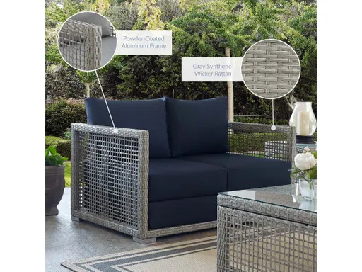 Weave conversational threads into a rollicking good time with the Aura Outdoor Patio Loveseat. The Aura two-seater couch comes with a synthetic gray-on-gray tone wicker rattan weave and a powder-coated aluminum frame that delivers a softly versatile outdoor collection that shifts to meet the needs of the moment. Outfitted with machine washable and fade resistant all-weather fabric cushions, and designed for immersive seating, Aura is an outdoor loveseat that will make your outdoor spot the focal point of good memories and festive gatherings while enhancing your patio, backyard or poolside arena. Featuring thick cushions and non-marking foot caps, enjoy enhanced comfort with this reliable piece of outdoor furniture. Comes fully assembled.
