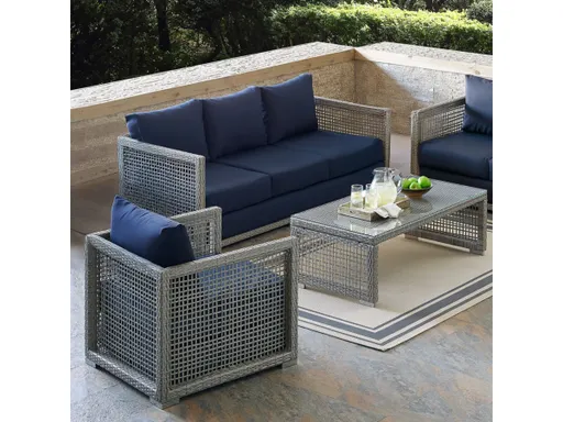 Weave conversational threads into a rollicking good time with the Aura Outdoor Patio Collection. Aura comes with a synthetic gray-on-gray tone wicker rattan weave and a powder-coated aluminum frame that delivers a softly versatile outdoor collection that shifts to meet the needs of the moment. Outfitted with machine washable and fade resistant all-weather fabric cushions, and designed with an extra wide and deep body, Aura will make your outdoor spot the focal point of good memories and festive gatherings while enhancing your patio, backyard or poolside arena. Featuring thick cushions and chrome plated anti-skid feet, enjoy spacious seating and enhanced comfort with this reliable piece of outdoor furniture. Comes fully assembled.