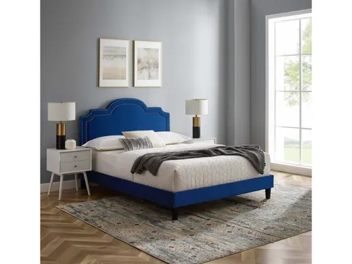 Usher quiet elegance into your master bedroom or guest room with the Aviana Performance Velvet King Bed. Its gently undulating headboard with dense foam padding is accentuated by a precise nailhead trim, complementing mid-century modern, contemporary, or eclectic decors. Brimming with glam deco appeal, Aviana is finely tailored in stain-resistant performance velvet. The well-constructed MDF frame provides a sturdy foundation for memory foam, innerspring, latex, and hybrid mattresses. This modern king bed features a well-crafted poplar wood slat support system, eliminating the need for a box spring, and a reinforced center beam with two support legs for enhanced stability. Aviana stands on tapered black wood legs with non-marking foot caps. Assembly required; weight capacity 800 lbs.